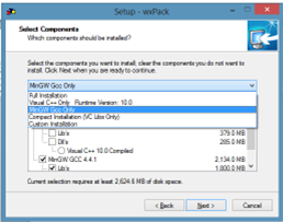 - Seleccionar en el instalador para instalar para el compilador Mingw (en los pasos anteriores se instaló éste).