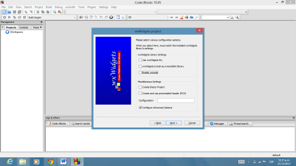 l. Dar en Next y activar la casilla que dice ‘Use __WXDEBUG__and Debug wxWidgets lib’