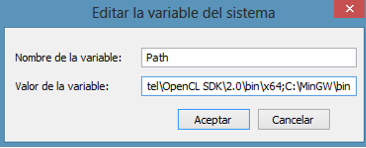 Saldrán muchas rutas separadas por punto y coma, no modifiques ninguna, sólo tendrás que agregar la ruta donde se encuentran los ejecutables del compilador, en mi caso es ‘C:\MinGW\bin’, si instalaste Code::Blocks con el compilador incluido, la ruta típica sería ‘C:\Program Files\CodeBlocks\bin’